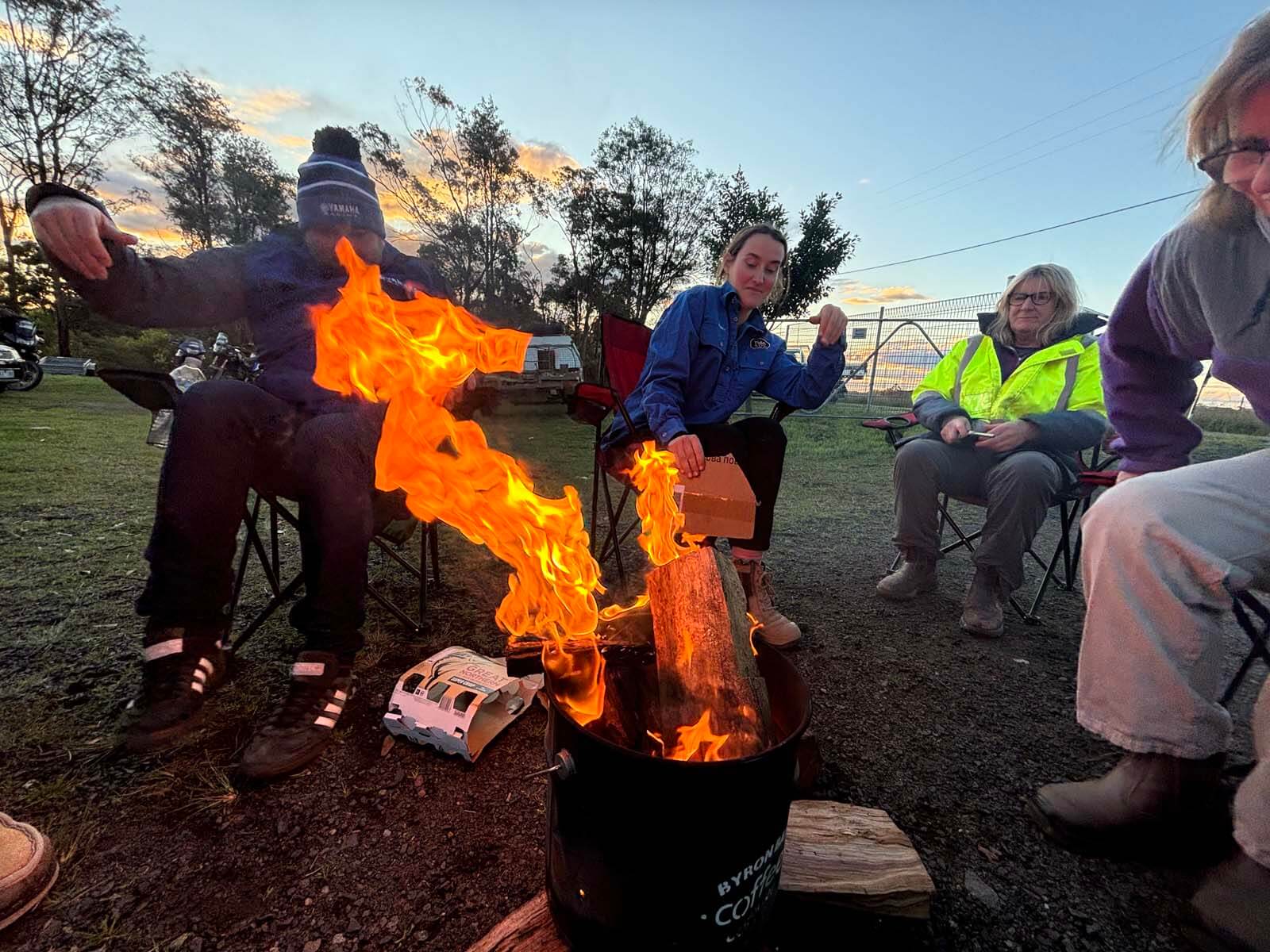 Back at Mangrove Mountain there are camping spots available and around the camp-fire that evening Mick demonstrates tyre changing as Abbey and Liz fire up the BBQ.