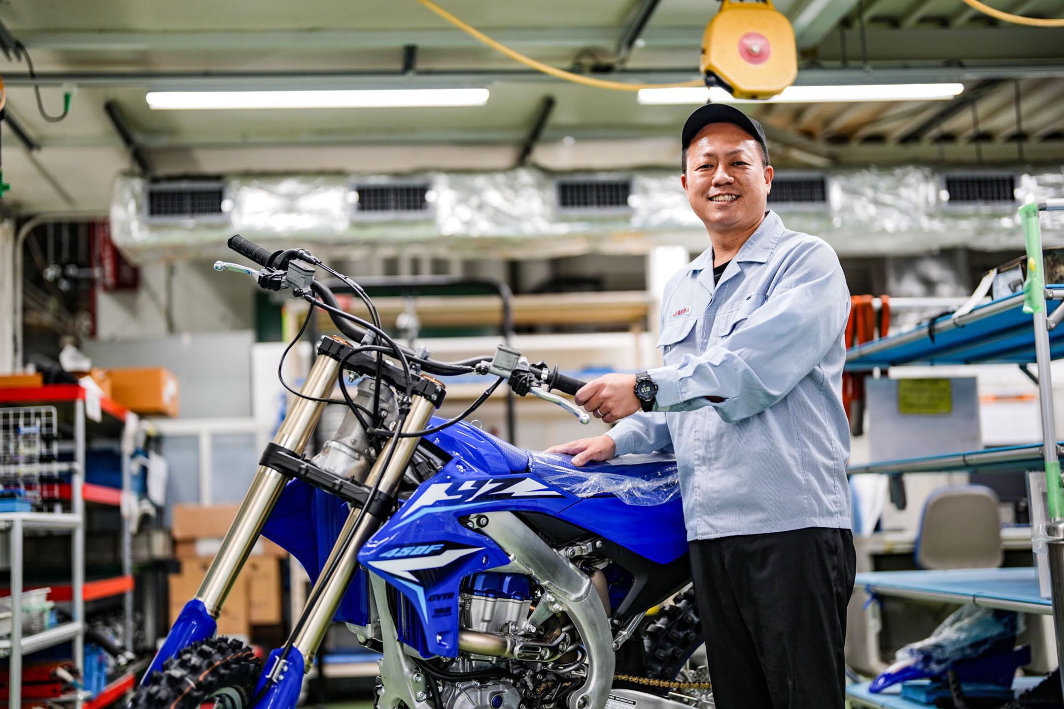 After joining the company, he started at the engine factory in Iwata Minami, assembling the Para 4 series. He spent around five years in quality control before transferring to the YZ body assembly line, preparing for new model production across the range—YZ65 through 450F, plus WR and FX models. He later returned to engine assembly (again covering YZ and WR), and when he moved into the quality control department, he was still working on YZ. In total, he estimates 11 or 12 years involved with the YZ.
